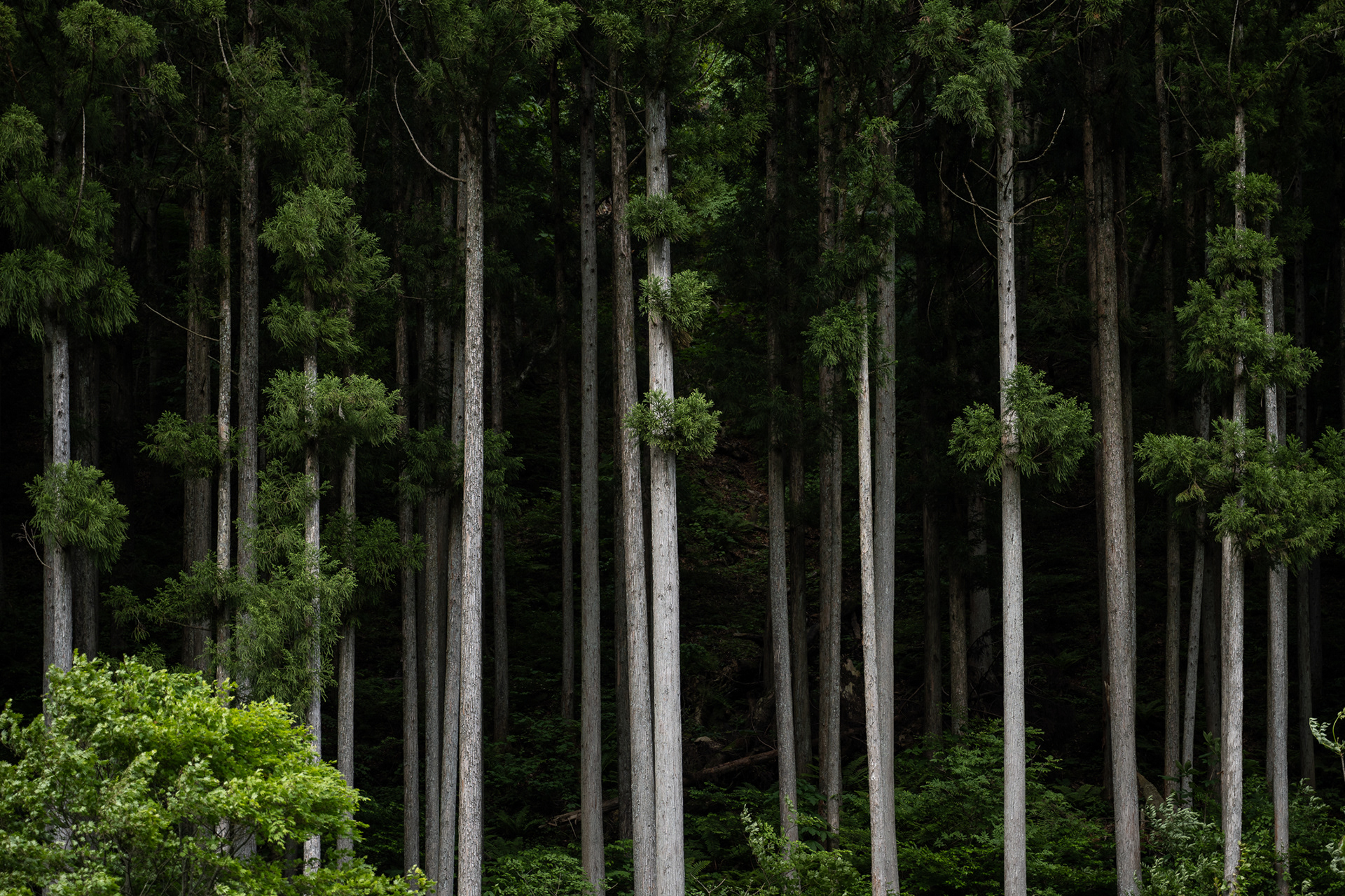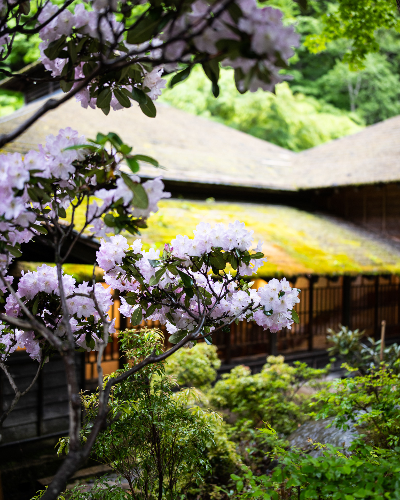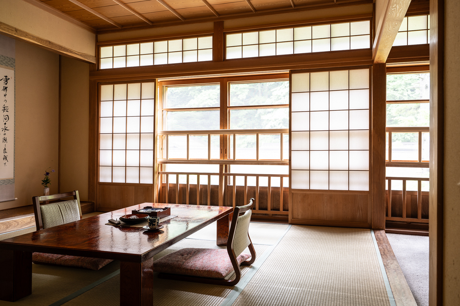 Large sliding doors (shōji) made of wood and translucent paper filter daylight into the room. These open onto a view of the surrounding forest, where moss, stone, water, and shaped trees create a living painting.