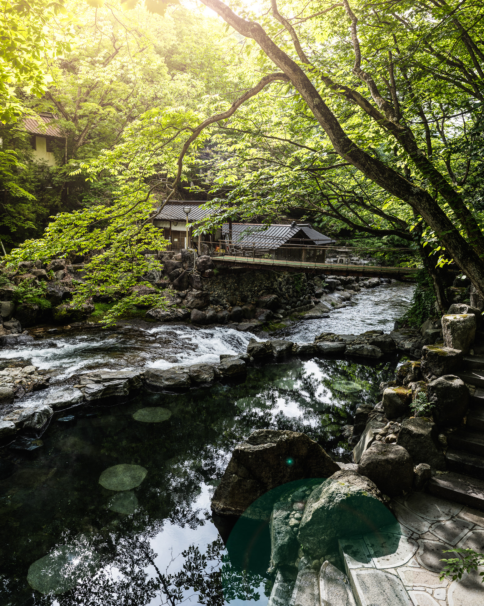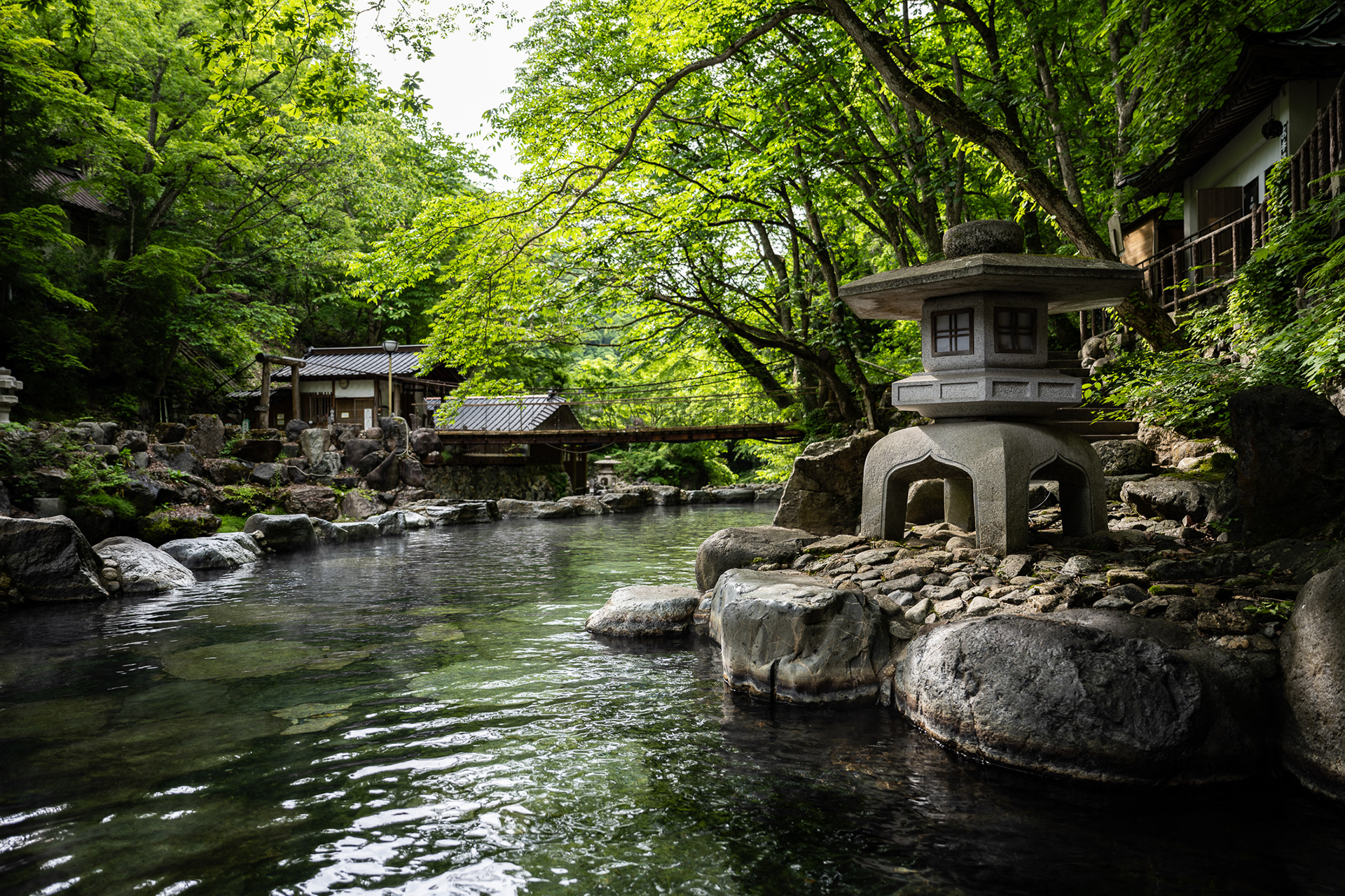 As you cross the bridge, the sound of the river becomes dominant, and the view opens toward forested slopes and steam rising from the baths downstream. This moment marks a clear psychological shift: the built environment recedes, and the bathing landscape comes into focus. The bridge functions less as a viewpoint and more as a threshold - separating daily routines from the act of bathing.