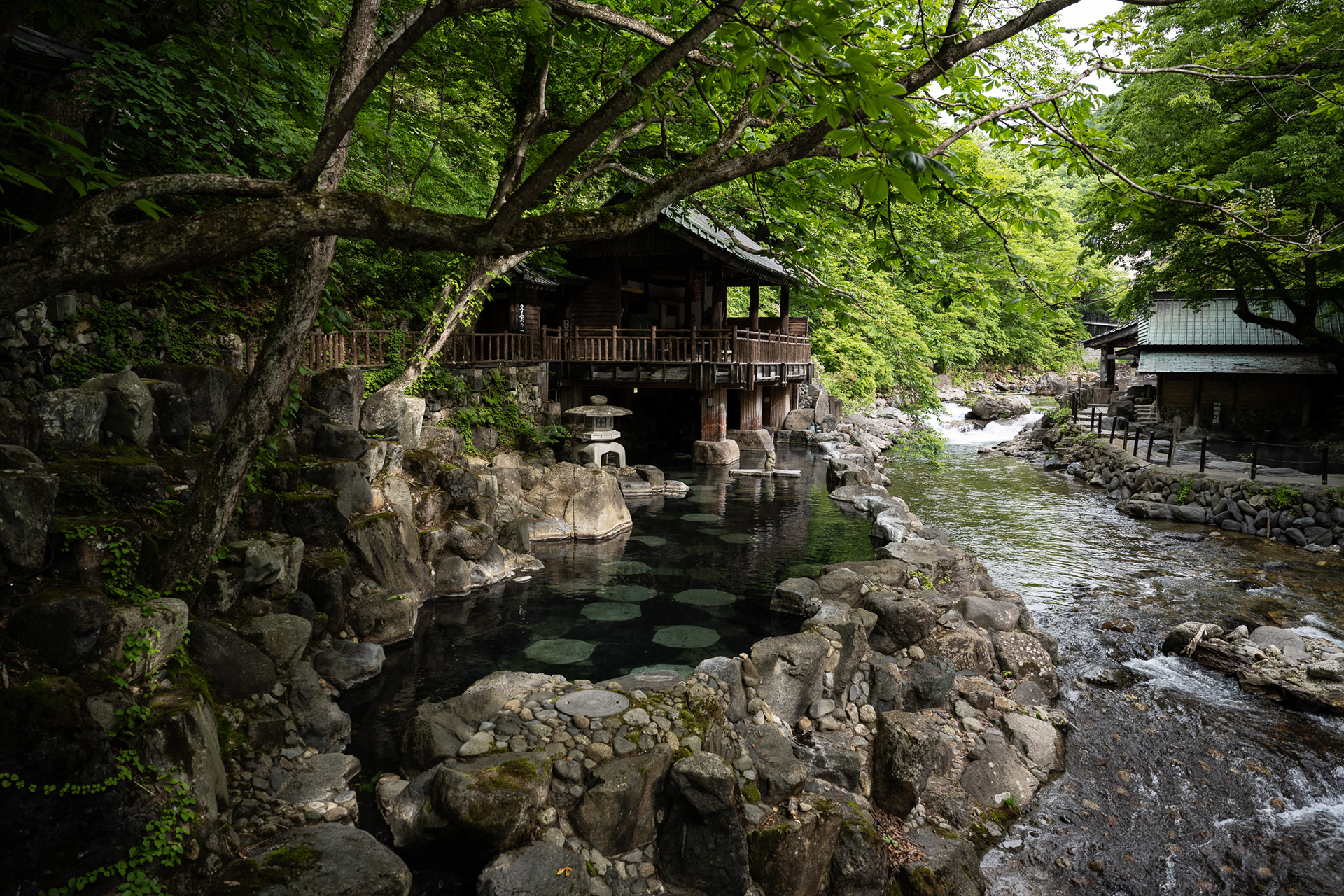 Having crossed the suspension bridge you walk along trees entering the hot spring area. There are four main outdoor bath areas - three mixed-gender (konyoku) and one women-only bath. Together they form one of Japan’s largest open-air hot spring complexes with around 850 m² of bathing space. The entire outdoor bathing area is laid out along the edge of the Takaragawa River.